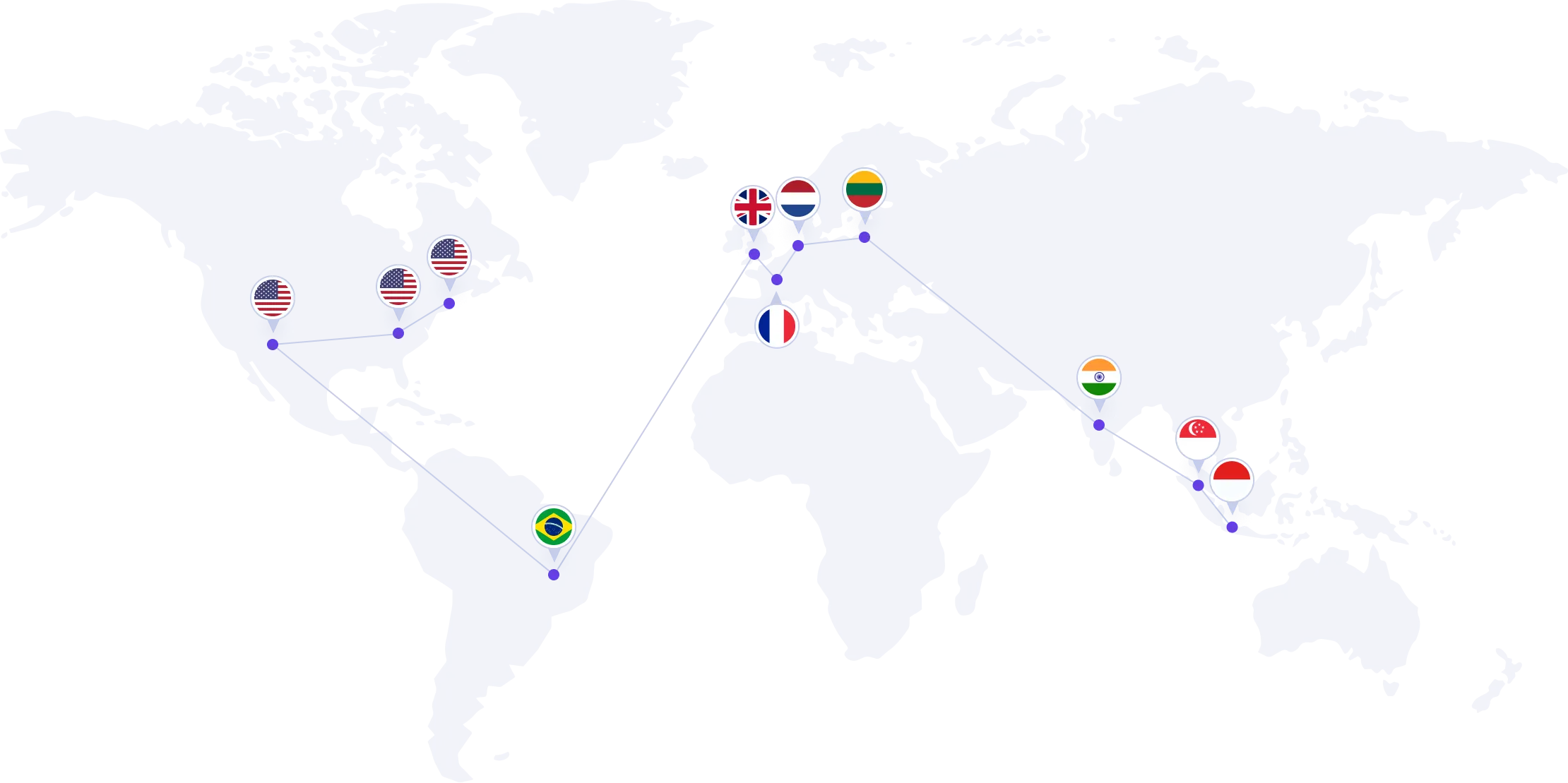 Servidores nos EUA, Reino Unido, França, Índia, Cingapura, Indonésia, Brasil, Lituânia e Holanda.